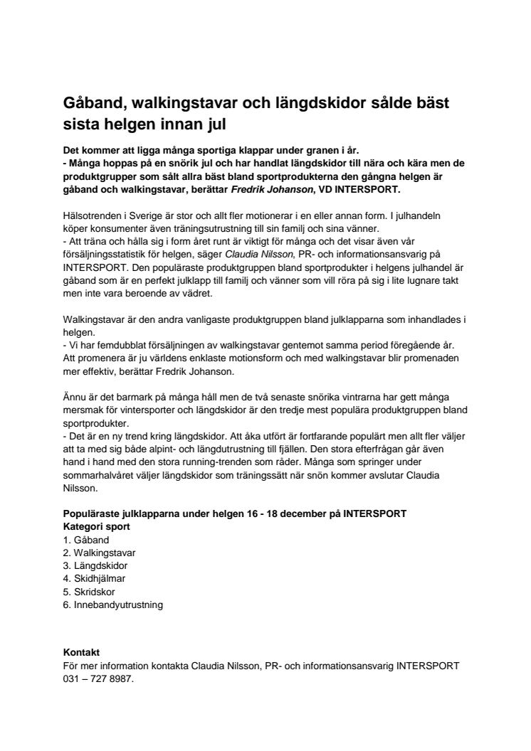- Många hoppas på en snörik jul och har handlat längdskidor till nära och kära men de produktgrupper som sålt allra bäst bland sportprodukterna den gångna helgen är gåband och walkingstavar, berättar Fredrik Johanson, VD INTERSPORT.