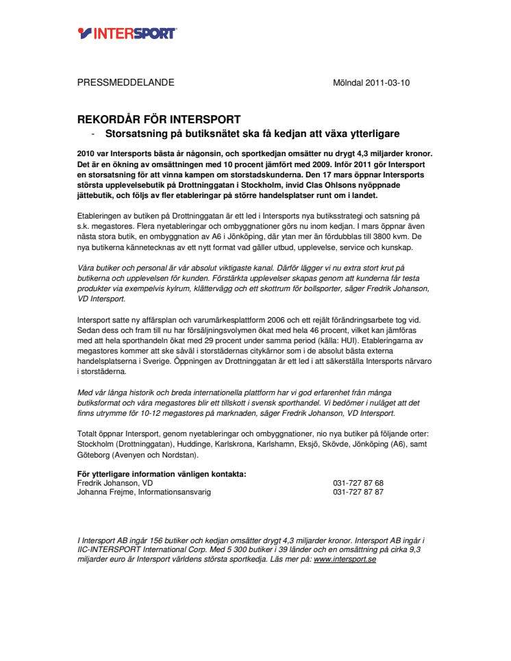 2010 var Intersports bästa år någonsin, och sportkedjan omsätter nu drygt 4,3 miljarder kronor. Det är en ökning av omsättningen med 10 procent jämfört med 2009. Inför 2011 gör Intersport en storsatsning för att vinna kampen om storstadskunderna.