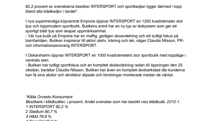 82,2 procent av svenskarna besöker INTERSPORT och sportkedjan ligger därmed i topp bland alla klädkedjor i landet*.