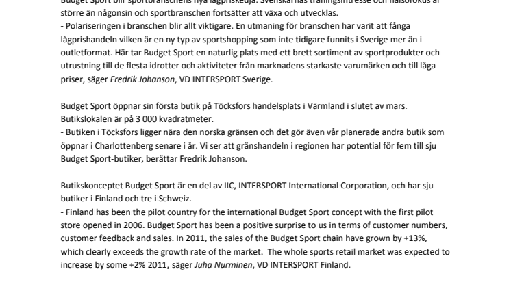 - Finland has been the pilot country for the international Budget Sport concept with the first pilot store opened in 2006. Budget Sport has been a positive surprise to us in terms of customer numbers, customer feedback and sales. In 2011, the sales of the Budget Sport chain have grown by +13%, which clearly exceeds the growth rate of the market. The whole sports retail market was expected to increase by some +2% 2011, säger Juha Nurminen, VD INTERSPORT Finland.