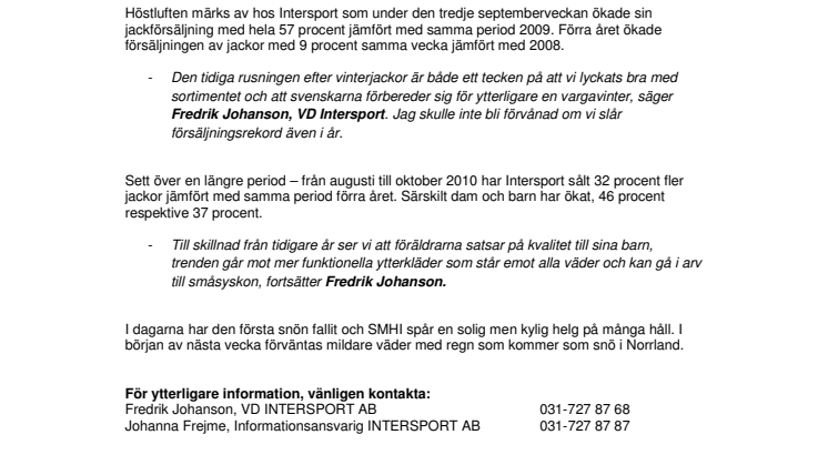 Höstluften märks av hos Intersport som under den tredje septemberveckan ökade sin jackförsäljning med hela 57 procent jämfört med samma period 2009. Förra året ökade försäljningen av jackor med 9 procent samma vecka jämfört med 2008.
