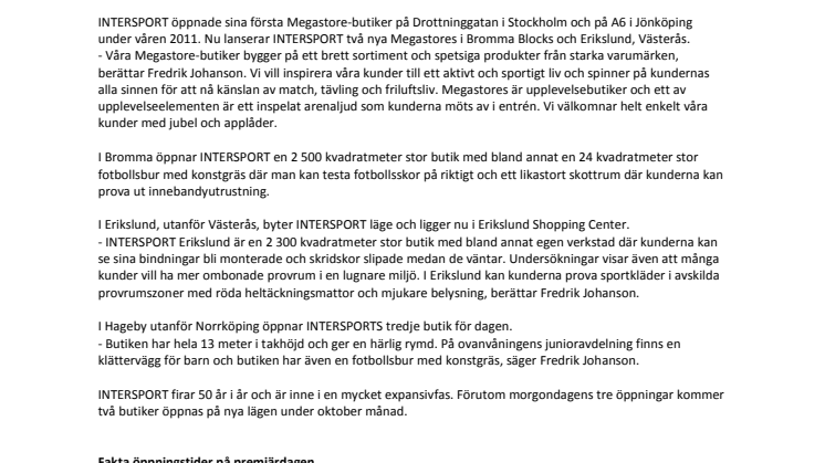 - Det är med glädje vi imorgon öppnar i Bromma Blocks och Hageby, Norrköping samtidigt som vi öppnar en butik med nytt läge i Erikslund, Västerås, berättar Fredrik Johanson, VD INTERSPORT.