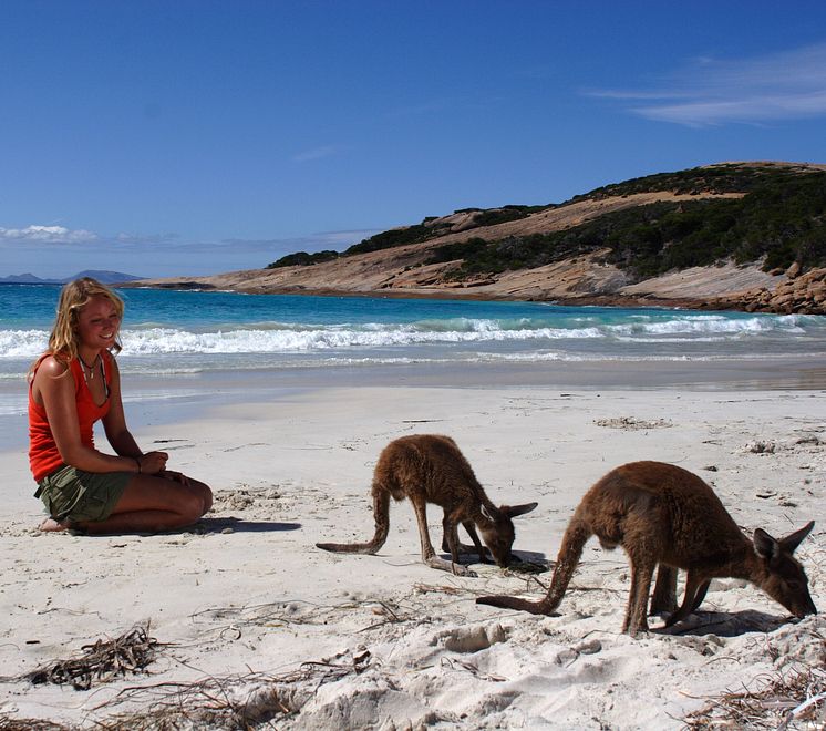 Man kan se wallabies som är en mindre modell av känguruarten - lite överallt i Australien. Här är det i västra Australien som de leker på stranden.