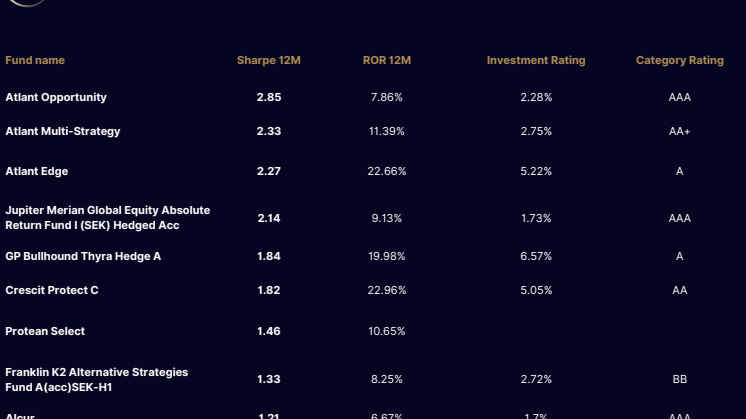 Under det gångna året har förvaltarteamet på Atlant Fonder uppnått enastående resultat. Deras fonder har intagit både första, andra och tredje platsen (!) årets utmärkelse. Förvaltarteamet har visat en imponerande förmåga att balansera riskkontroll och avkastning och Atlant Opportunity har erhållit högsta betyget inom Investment Rating – Triple Alpha.