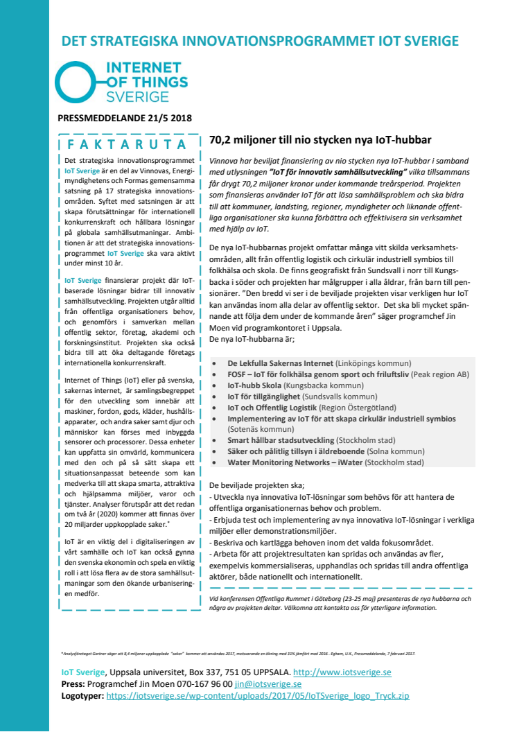 Vinnova har beviljat finansiering av nio stycken nya IoT-hubbar i samband med utlysningen ”IoT för innovativ samhällsutveckling” vilka tillsammans får drygt 70,2 miljoner kronor under kommande treårsperiod.