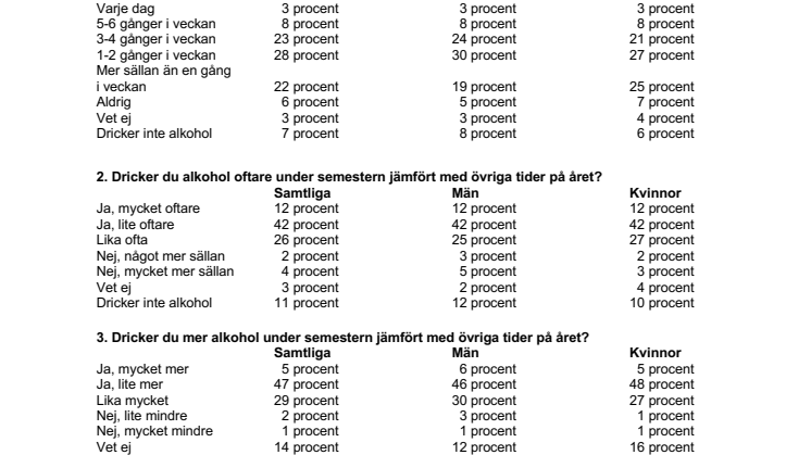 - I ålderskategorin 18-34 år svarar 50 procent att de oftare dricker alkohol under semestern jämfört med övriga tider på året. Motsvarande siffra bland personer mellan 35-54 år var 63 procent och bland de som är 55 år och uppåt var siffran 46 procent.