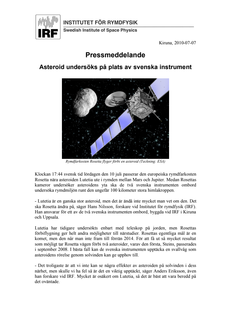 Klockan 17:44 svensk tid lördagen den 10 juli passerar den europeiska rymdfarkosten Rosetta nära asteroiden Lutetia ute i rymden mellan Mars och Jupiter. Medan Rosettas kameror undersöker asteroidens yta ska de två svenska instrumenten ombord undersöka rymdmiljön runt den ungefär 100 kilometer stora himlakroppen.