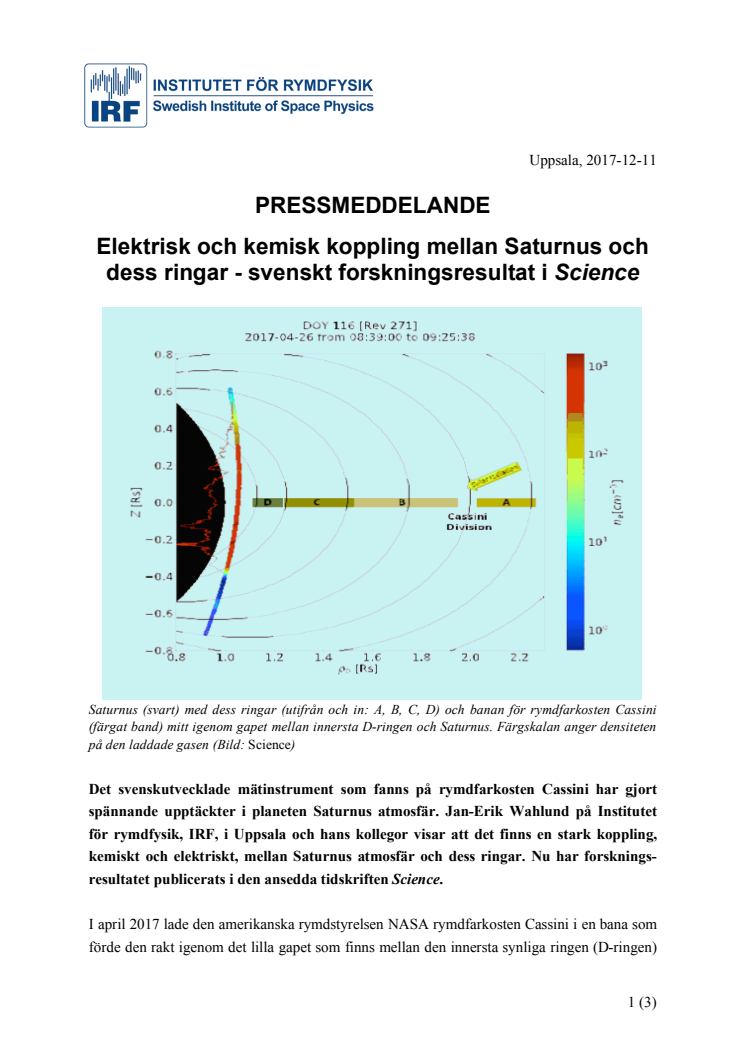 Det svenskutvecklade mätinstrument som fanns på rymdfarkosten Cassini har gjort spännande upptäckter i planeten Saturnus atmosfär. Jan-Erik Wahlund på Institutet för rymdfysik, IRF, i Uppsala och hans kollegor visar att det finns en stark koppling, kemiskt och elektriskt, mellan Saturnus atmosfär och dess ringar. Nu har forsknings¬resultatet publicerats i den ansedda tidskriften Science.