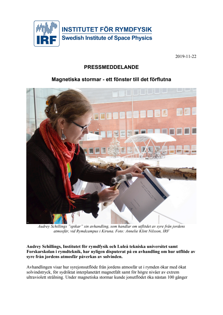 Audrey Schillings, Institutet för rymdfysik och Luleå tekniska universitet, har nyligen disputerat på en avhandling om hur utflöde av syre från jordens atmosfär påverkas av solvinden. Avhandlingen visar hur syrejonsutflöde från jordens atmosfär ut i rymden ökar med ökat solvindstryck, för sydriktat interplanetärt magnetfält samt för högre nivåer av extrem ultraviolett strålning.