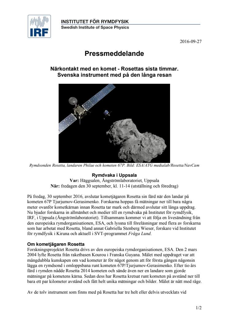 På fredag, 30 september 2016, avslutar kometjägaren Rosetta sin färd när den landar på kometen 67P Tjurjumov-Gerasimenko. Forskarna hoppas få mätningar ner till bara några meter ovanför kometkärnan innan Rosetta tar mark och därmed avslutar sitt långa uppdrag. Nu bjuder forskarna in allmänhet och medier till en rymdvaka på Institutet för rymdfysik, IRF, i Uppsala (Ångströmlaboratoriet).