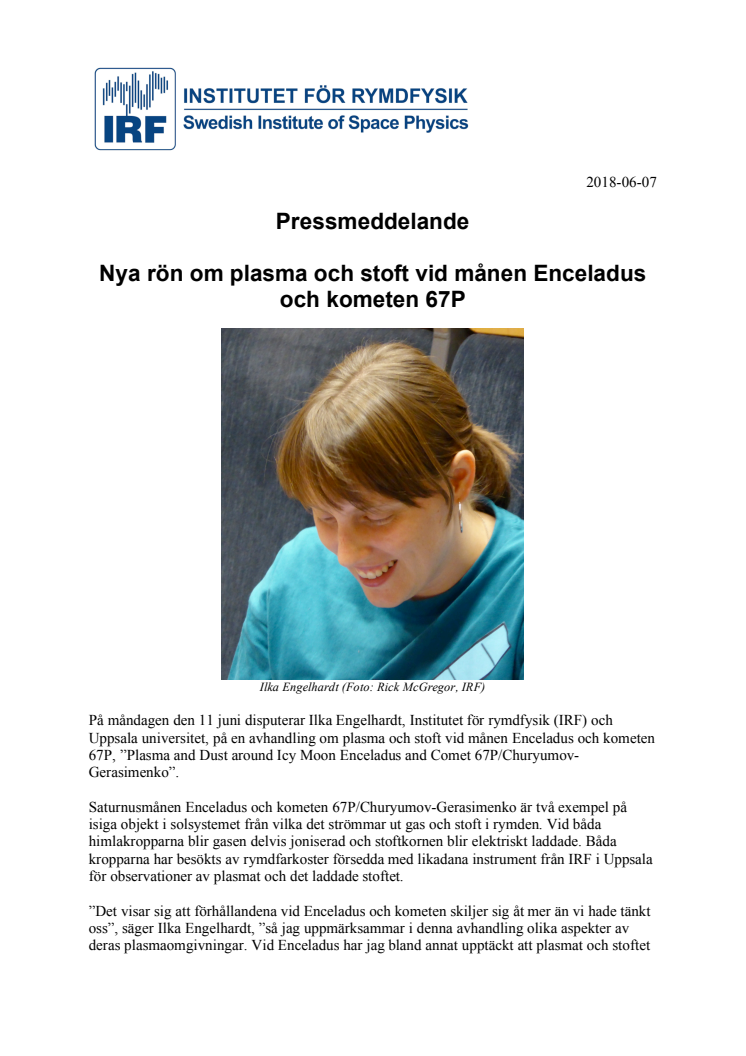 På måndagen den 11 juni disputerar Ilka Engelhardt, Institutet för rymdfysik (IRF) och Uppsala universitet, på en avhandling om plasma och stoft vid månen Enceladus och kometen 67P, ”Plasma and Dust around Icy Moon Enceladus and Comet 67P/Churyumov-Gerasimenko”.