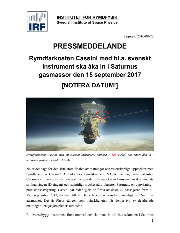 Nu är det dags för den sista stora finalen av mätningar och vetenskapliga upptäckter med rymdfarkosten Cassini vid planeten Saturnus. Ett svenskbyggt instrument finns ombord och ska mäta in till sista sekunden i Saturnus atmosfär innan Cassini brinner upp i gasjättens molnmassor. Instrumentet, en s.k. Langmuirsond, har utvecklats vid Institutet för rymdfysik, IRF, i Uppsala.