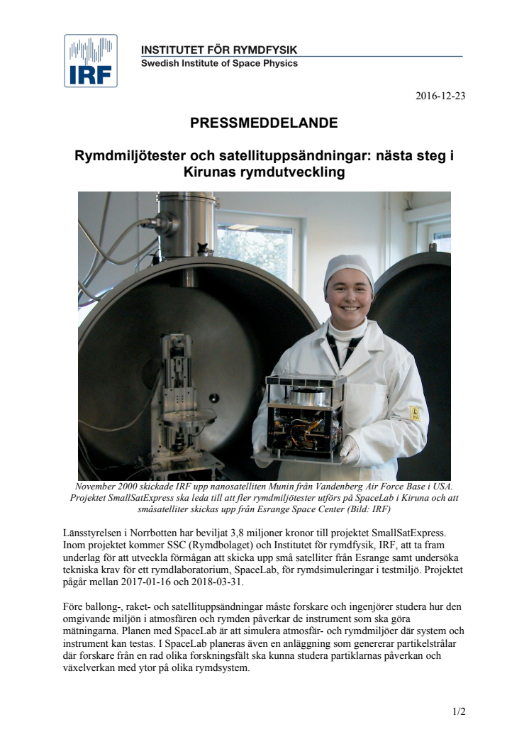 Länsstyrelsen i Norrbotten har beviljat 3,8 miljoner kronor till projektet SmallSatExpress. Inom projektet kommer SSC (Rymdbolaget) och Institutet för rymdfysik, IRF, att ta fram underlag för att utveckla förmågan att skicka upp små satelliter från Esrange samt undersöka tekniska krav för ett rymdlaboratorium, SpaceLab, för rymdsimuleringar i testmiljö.