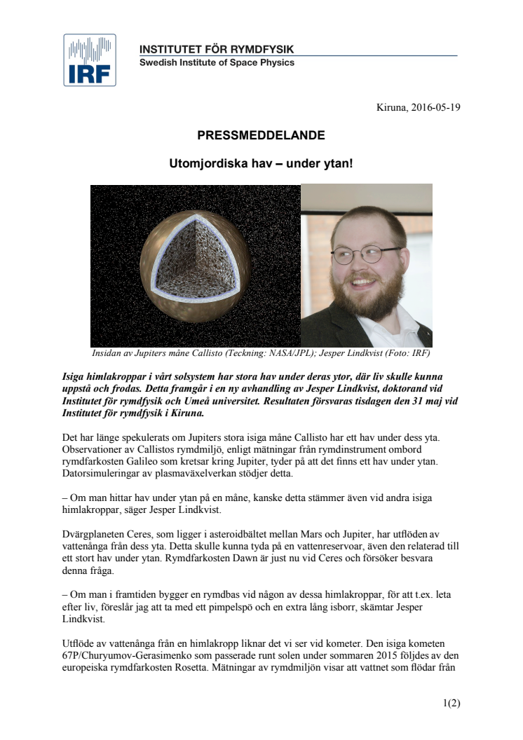 Isiga himlakroppar i vårt solsystem har stora hav under deras ytor, där liv skulle kunna uppstå och frodas. Detta framgår i en ny avhandling av Jesper Lindkvist, doktorand vid Institutet för rymdfysik och Umeå universitet. Resultaten försvaras tisdagen den 31 maj vid Institutet för rymdfysik i Kiruna.