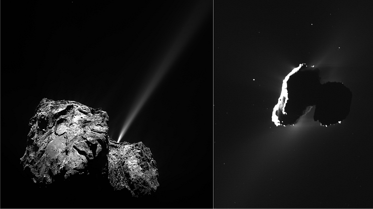 * Image: The nucleus of comet 67P/Churyumov-Gerasimenko in two different illumination conditions that highlight the different expressions of cometary activity. Image Credit: ESA/ROSETTA/OSIRIS/NAC *