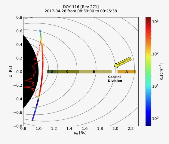Starka variationer i densitet tyder på att den elektrisk laddade delen av Saturnus atmosfär (den så kallade jonosfären) kopplar starkt till de synliga ringarna som består mestadels av ispartiklar som även de är elektriskt laddade.