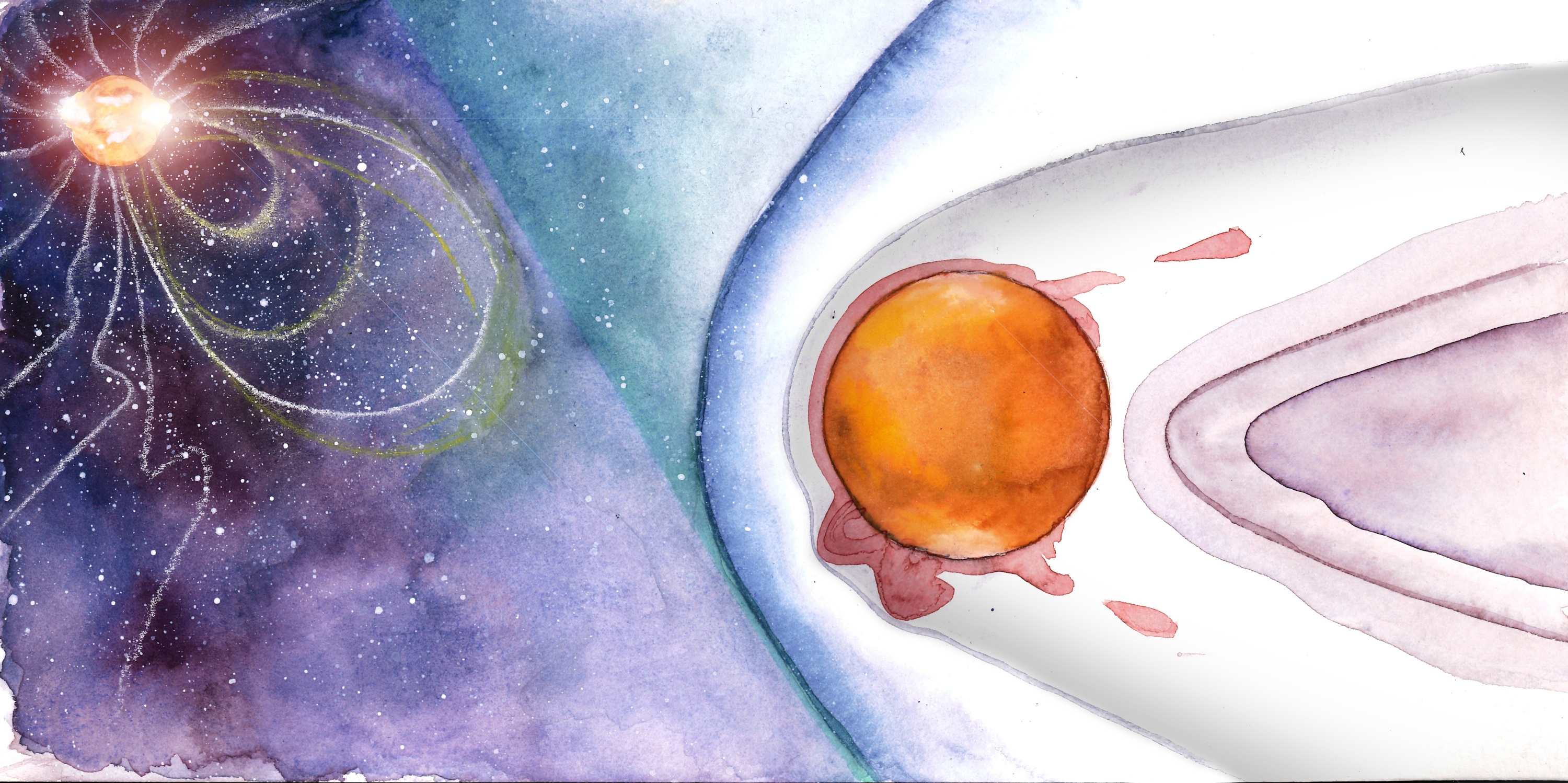 Till vänster: Laddade partiklar från solen (solvinden) bildar en inducerad magnetosfär runt Mars, som till skillnad från solen saknar ett eget magnetfält (målning: Anastasia Grigoryeva).