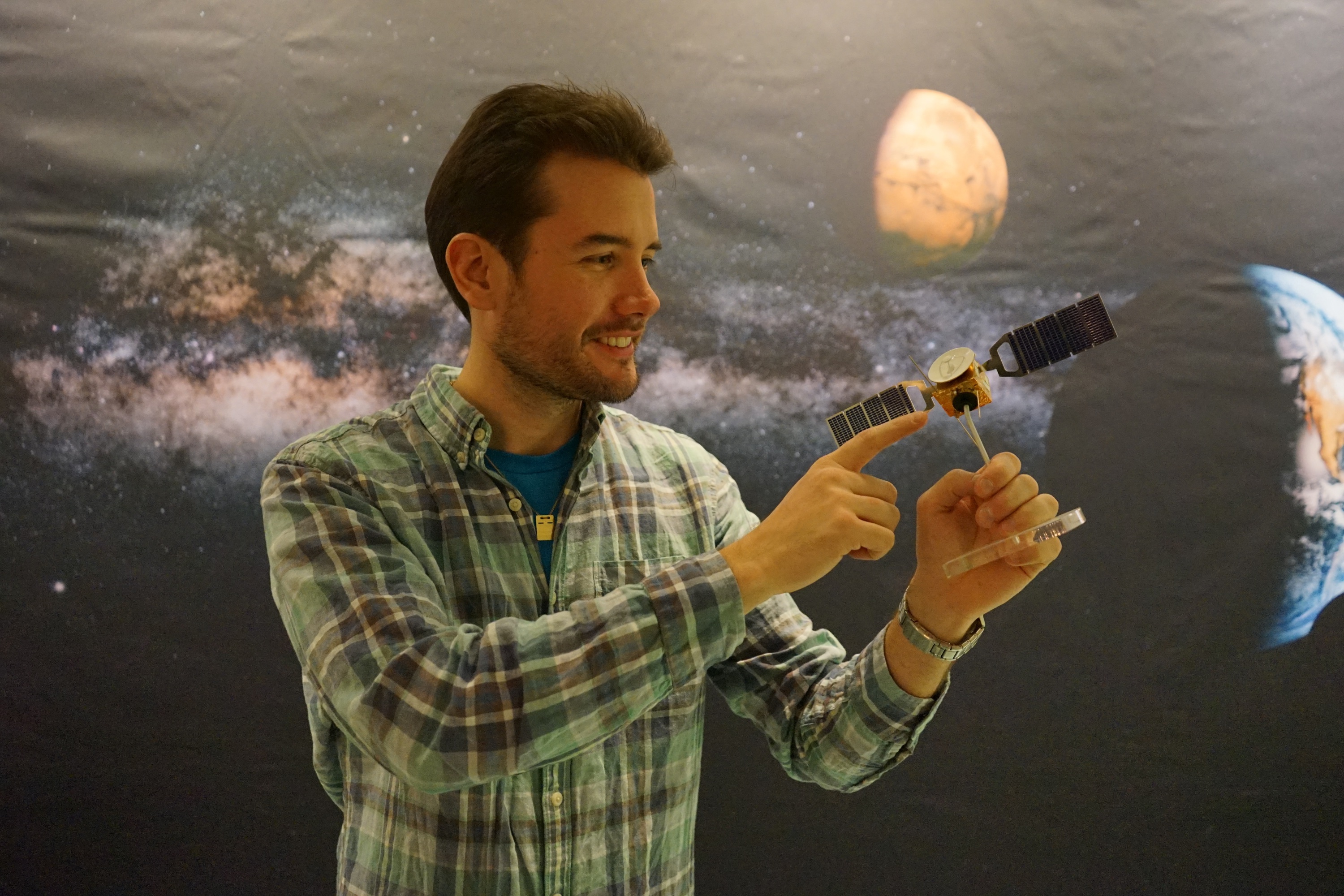 Till höger: Robin Ramstad visar placeringen av det svenska instrumentet ASPERA-3 på en modell av rymdsonden Mars Express (foto: Anastasia Grigoryeva)