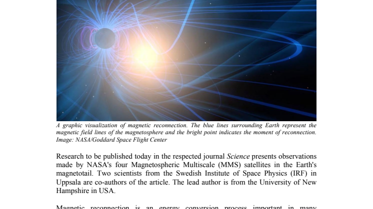 Research to be published today in the respected journal Science presents observations made by NASA's four Magnetospheric Multiscale (MMS) satellites in the Earth's magnetotail. Two scientists from the Swedish Institute of Space Physics (IRF) in Uppsala are co-authors of the article. The lead author is from the University of New Hampshire in USA.