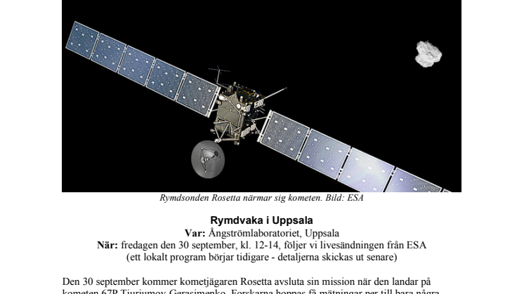 Nu bjuder forskarna in allmänhet och medier till en rymdvaka på Institutet för rymdfysik, IRF, i Uppsala (Ångströmlaboratoriet). Tillsammans kommer vi att följa en livesändning från den europeiska rymdorganisationen, ESA, och lyssna till föreläsningar med flera av forskarna som har arbetat med Rosetta, bland annat Gabriella Stenberg Wieser, forskare vid Institutet för rymdfysik i Kiruna och aktuell i SVT-programmet Fråga Lund.