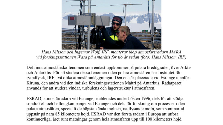 Det finns atmosfäriska fenomen som endast uppkommer på polara breddgrader, över Arktis och Antarktis. För att studera dessa fenomen i den polara atmosfären har Institutet för rymdfysik, IRF, två olika atmosfäranläggningar. Den ena är placerade vid Esrange utanför Kiruna, den andra vid den indiska forskningsstationen Maitri på Antarktis. Radarparet används för att studera vindar, turbulens och lagerstruktur i atmosfären.
