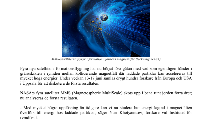 Fyra nya satelliter i formationsflygning har nu börjat lösa gåtan med vad som egentligen händer i gränsskikten i rymden mellan kolliderande magnetfält där laddade partiklar kan accelereras till mycket höga energier. Under veckan 13-17 juni samlas drygt hundra forskare från Europa och USA i Uppsala för att diskutera de första resultaten.