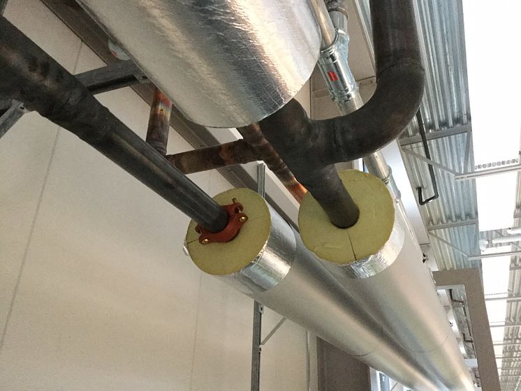 Projektet är projekterat enligt AMA VVS 2016 där man valt isoleringsnivå A. Detta innebär tjocka rörskålar för minsta möjliga energiförlust och detta krav möter CLIMPIPE Section Alu2, en energieffektiv rörskål med ytbeklädnad av rutmönstrad glastrådsförstärkt aluminiumfolie med marknadens bästa lambdavärde (isoleringsförmåga) för mineralull.