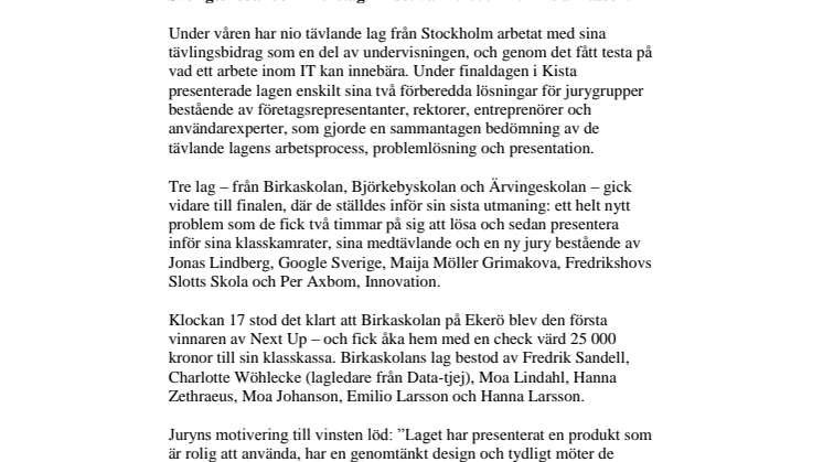 I torsdags eftermiddag kammade Birkaskolans åttondeklasslag hem segern i Next Up 2014, tävlingen där nio Stockholmsskolor tävlat lagvis med att lösa verklighetsbaserade problem från några av Sveriges ledande IT-företag. Priset var 25 000 kr till hela klassen.