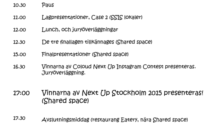 - Finaldagen föregås av en inspirationsdag, då de tävlande lagen får besöka de IT-företag som är profilpartners till Next Up.