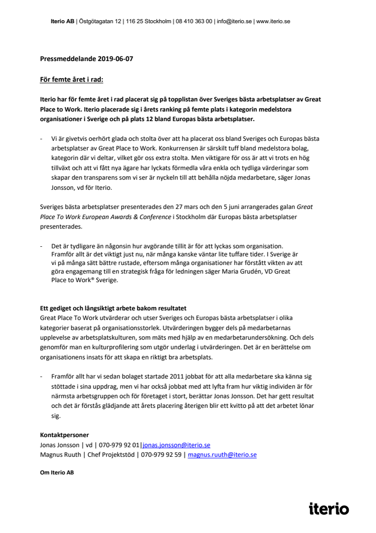 Iterio har för femte året i rad placerat sig på topplistan över Sveriges bästa arbetsplatser av Great Place to Work. Iterio placerade sig i årets ranking på femte plats i kategorin medelstora organisationer i Sverige och på plats 12 bland Europas bästa arbetsplatser.