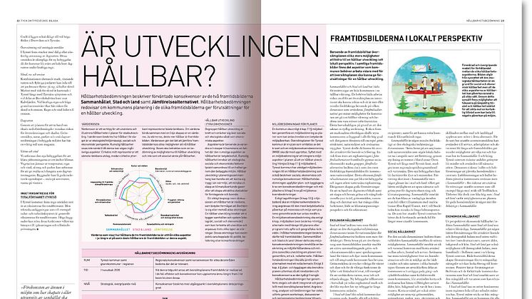 Hållbarhetsbedömningen, som finns med som bilaga till samrådstidningen, jämför framtidsbilderna ”Stad och land”, ”Sammanhållet” och ”Jämförelsealternativet” med utgångspunkt i ekologiska/miljömässiga, sociala och ekonomiska faktorer. Faktorerna påverkar varandra sinsemellan och när de samspelar ligger de tillsammans till grund för en stabil hållbar utveckling. ”Beroende av vilken framtidsbild som blir verklighet så kommer översiktsplanen påverka utvecklingen på olika sätt, både i ett lokalt och i ett regionalt perspektiv”, fortsätter Elisabeth Mörner. Framtidsbilderna har också ställts mot nationella mål för miljökvalitet och folkhälsa som tillsammans med hållbarhetsbedömningen illustreras i samrådstidningen.