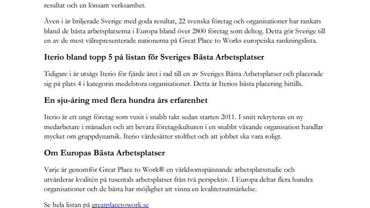 Den 14 juni publicerades listan Europas Bästa Arbetsplatser 2018 av Great Place To Work där Iterio placerade sig på plats 11 i kategorin medelstora organisationer.