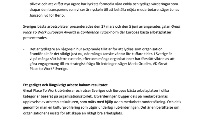 Vi är givetvis oerhört glada och stolta över att ha placerat oss bland Sveriges och Europas bästa arbetsplatser av Great Place to Work. Konkurrensen är särskilt tuff bland medelstora bolag, kategorin där vi deltar, vilket gör oss extra stolta. Men viktigare för oss är att vi trots en hög tillväxt och att vi fått nya ägare har lyckats förmedla våra enkla och tydliga värderingar som skapar den transparens som vi ser är nyckeln till att behålla nöjda medarbetare, säger Jonas Jonsson, vd för Iterio.