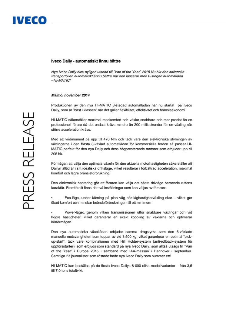 Nya Iveco Daily blev nyligen utsedd till ”Van of the Year” 2015.Nu blir den italienska transportbilen automatiskt ännu bättre när den lanserar med 8-stegad automatlåda - HI-MATIC!