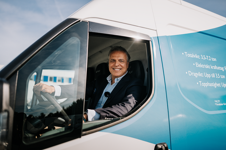 Vladimir Kojcevski ute och kör i en IVECO eDaily, elektrisk transportbil.