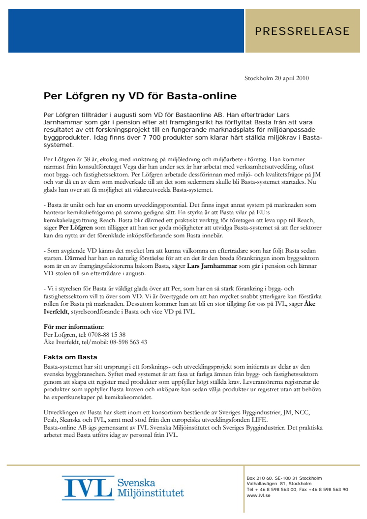 Per Löfgren tillträder i augusti som VD för Bastaonline AB. Han efterträder Lars Jarnhammar som går i pension efter att framgångsrikt ha förflyttat Basta från att vara resultatet av ett forskningsprojekt till en fungerande marknadsplats för miljöanpassade byggprodukter. Idag finns över 7 700 produkter som klarar hårt ställda miljökrav i Basta-systemet.
