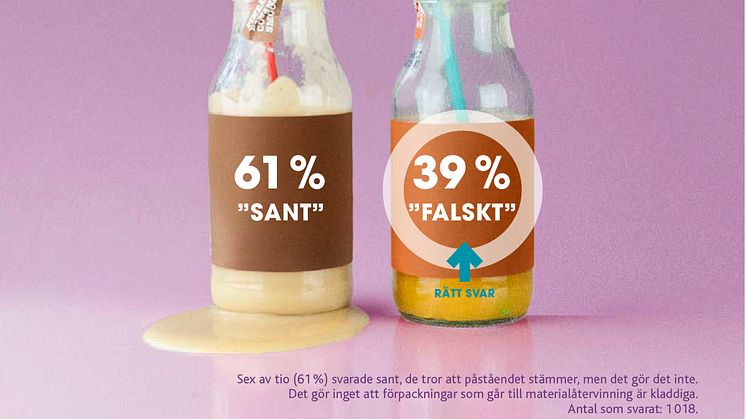- 4 av 10 (42 %) tror att det är okej att slänga dricksglas och fönsterglas i insamlingsbehållaren för glasförpackningar, men det är det inte.