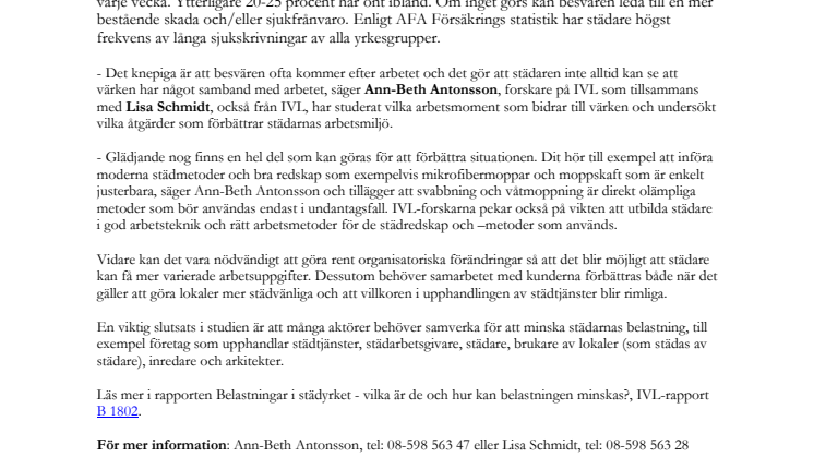 Läs mer i rapporten Belastningar i städyrket - vilka är de och hur kan belastningen minskas?, IVL-rapport B 1802.