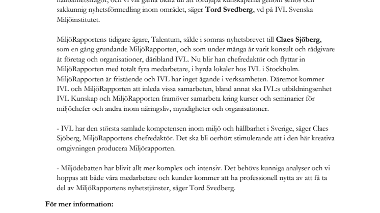 MiljöRapportens tidigare ägare, Talentum, sålde i somras nyhetsbrevet till Claes Sjöberg, som en gång grundande MiljöRapporten, och som under många år varit konsult och rådgivare åt företag och organisationer, däribland IVL. Nu blir han chefredaktör och flyttar in MiljöRapporten med totalt fyra medarbetare, i hyrda lokaler hos IVL i Stockholm. MiljöRapporten är fristående och IVL har inget ägande i verksamheten. Däremot kommer IVL och MiljöRapporten att inleda vissa samarbeten, bland annat ska IVL:s utbildningsenhet IVL Kunskap och MiljöRapporten framöver samarbeta kring kurser och seminarier för miljöchefer och andra inom näringsliv, myndigheter och organisationer.