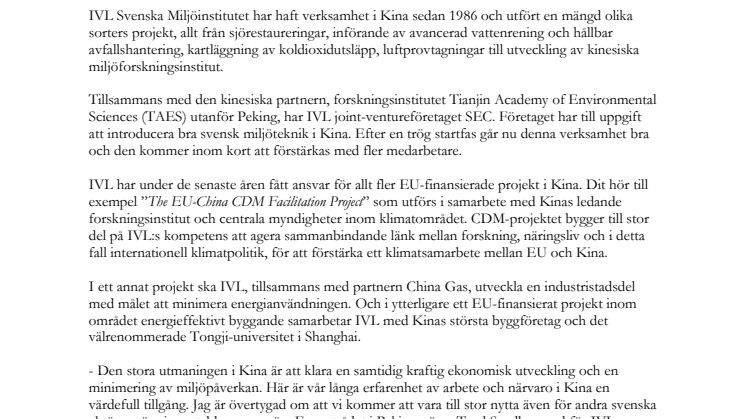 - Den stora utmaningen i Kina är att klara en samtidig kraftig ekonomisk utveckling och en minimering av miljöpåverkan. Här är vår långa erfarenhet av arbete och närvaro i Kina en värdefull tillgång. Jag är övertygad om att vi kommer att vara till stor nytta även för andra svenska aktörer när vi nu etablerar oss nära Exportrådet i Peking, säger Tord Svedberg, vd för IVL Svenska Miljöinstitutet.