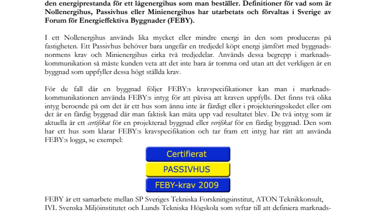 FEBY är ett samarbete mellan SP Sveriges Tekniska Forskningsinstitut, ATON Teknikkonsult, IVL Svenska Miljöinstitutet och Lunds Tekniska Högskola som syftar till att definiera marknadsledande lågenergibegrepp och kunskapsspridning om energieffektiva byggnader.