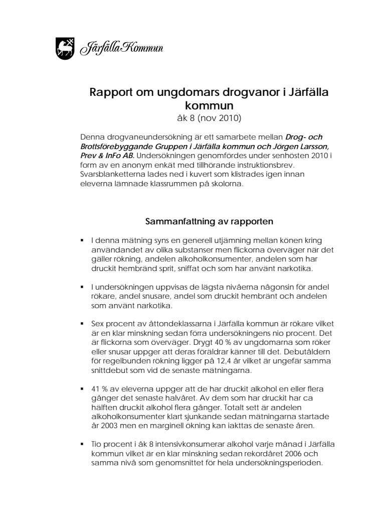 Sammanfattning ungdomars drogvanor i Järfälla kommun år 8 2010