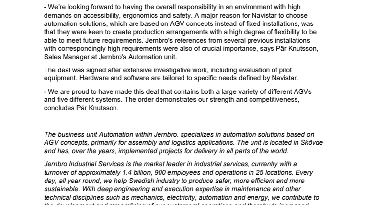 – Vi ser fram emot att få helhetsansvaret i en miljö med högt ställda krav på tillgänglighet, ergonomi och säkerhet. Ett tungt skäl för Navistar att välja automationslösningar, som är baserade på AGV-koncept istället för fasta installationer, var att de var angelägna om att skapa produktionsupplägg med hög grad av flexibilitet för att kunna möta framtida krav. Jernbros referenser från ett flertal tidigare installationer med motsvarande höga kravställning var också av avgörande betydelse, berättar Pär Knutsson, säljchef på Jernbros automationsavdelning.