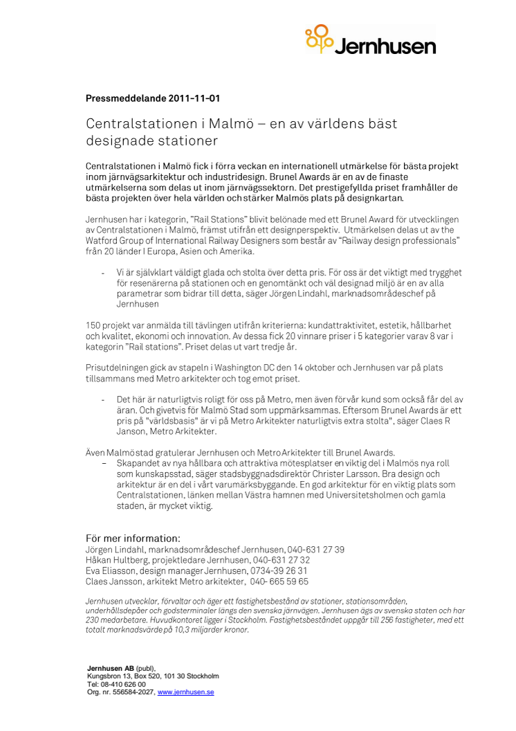 Centralstationen i Malmö fick i förra veckan en internationell utmärkelse för bästa projekt inom järnvägsarkitektur och industridesign. Brunel Awards är en av de finaste utmärkelserna som delas ut inom järnvägssektorn. Det prestigefyllda priset framhåller de bästa projekten över hela världen och stärker Malmös plats på designkartan.