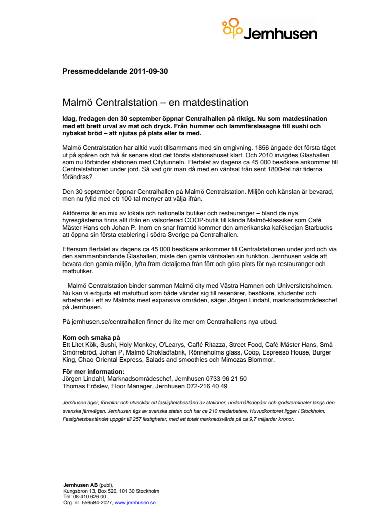 Idag, fredagen den 30 september öppnar Centralhallen på riktigt. Nu som matdestination med ett brett urval av mat och dryck. Från hummer och lammfärslasagne till sushi och nybakat bröd – att njutas på plats eller ta med.