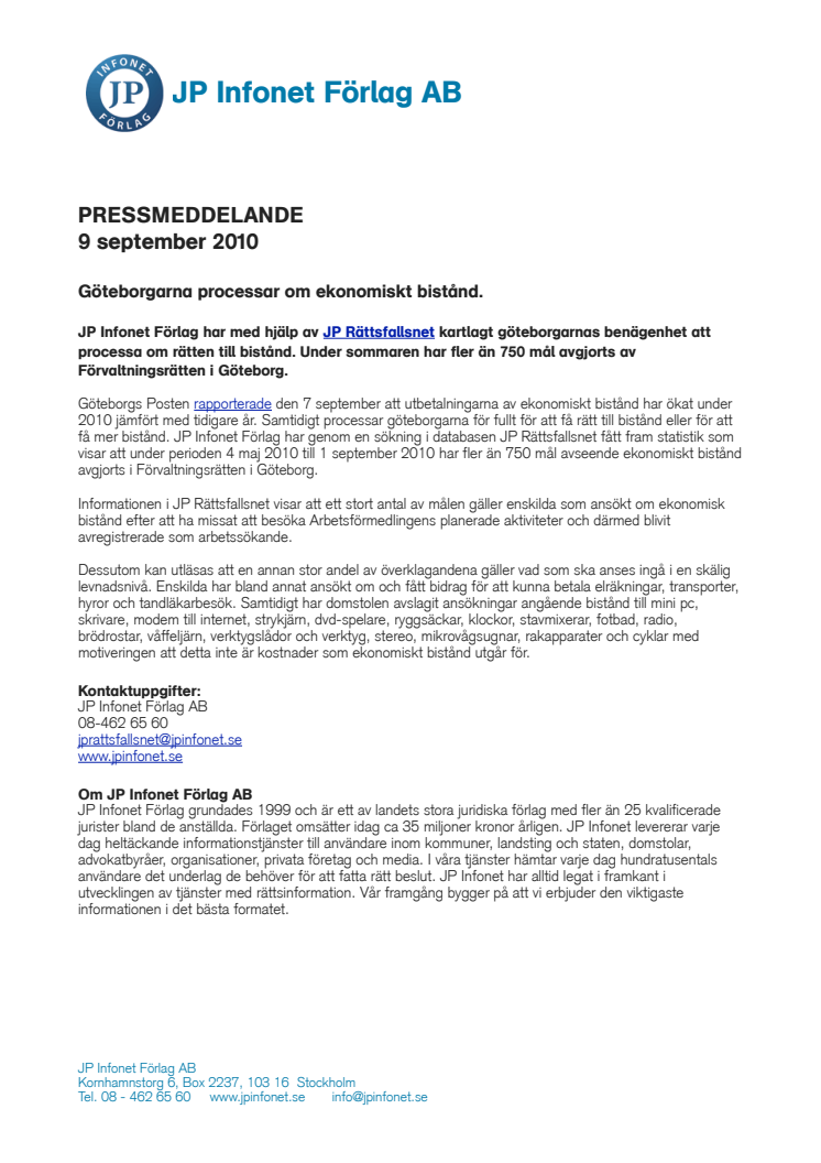 JP Infonet AB har med hjälp av JP Rättsfallsnet kartlagt göteborgarnas benägenhet att processa om rätten till bistånd. Under sommaren har fler än 750 mål avgjorts av Förvaltningsrätten i Göteborg.