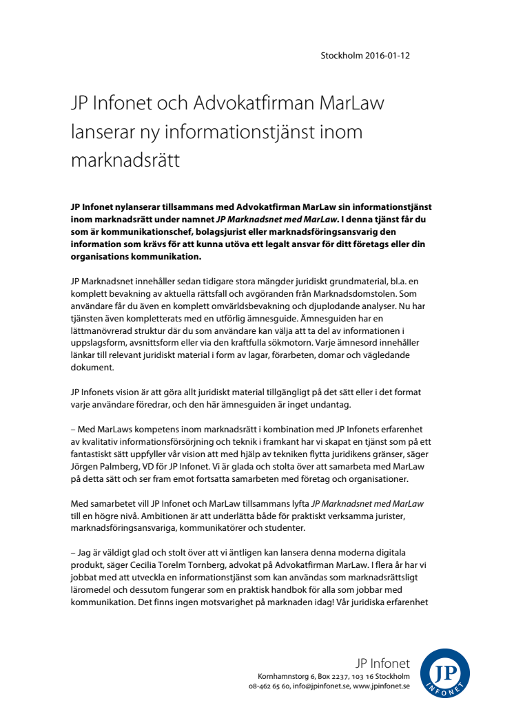 JP Infonet nylanserar tillsammans med Advokatfirman MarLaw sin informationstjänst inom marknadsrätt under namnet JP Marknadsnet med MarLaw. I denna tjänst får du som är kommunikationschef, bolagsjurist eller marknadsföringsansvarig den information som krävs för att kunna utöva ett legalt ansvar för ditt företags eller din organisations kommunikation.