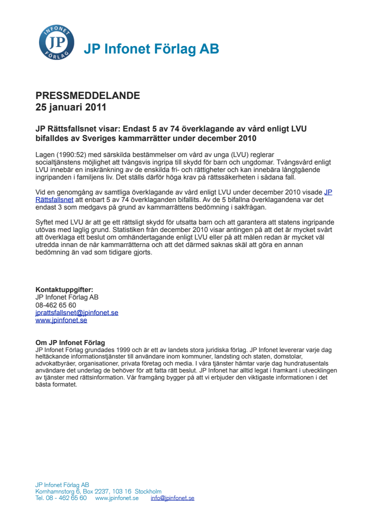 JP Rättsfallsnet visar: Endast 5 av 74 överklagande av vård enligt LVU bifalldes av Sveriges kammarrätter under december 2010