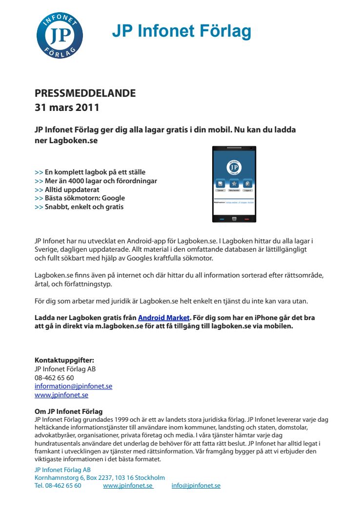 JP Infonet AB ger dig alla lagar gratis i din mobil. Nu kan du ladda ner Lagboken.se
