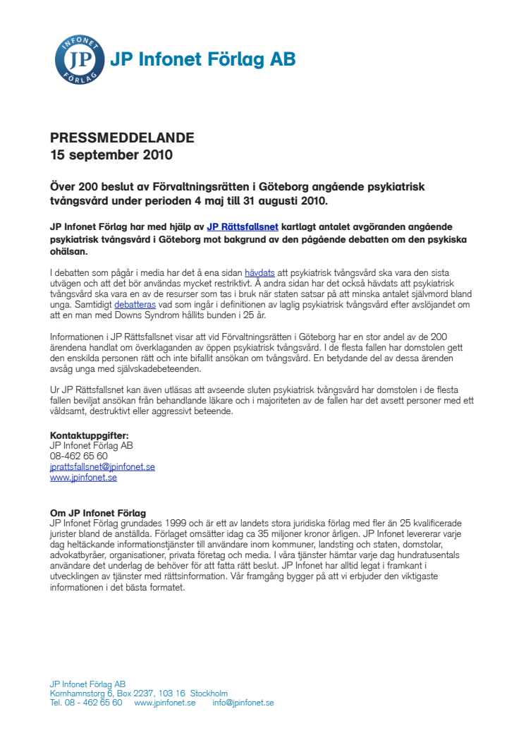 JP Infonet AB har med hjälp av JP Rättsfallsnet kartlagt antalet avgöranden angående psykiatrisk tvångsvård i Göteborg mot bakgrund av den pågående debatten om den psykiska ohälsan.